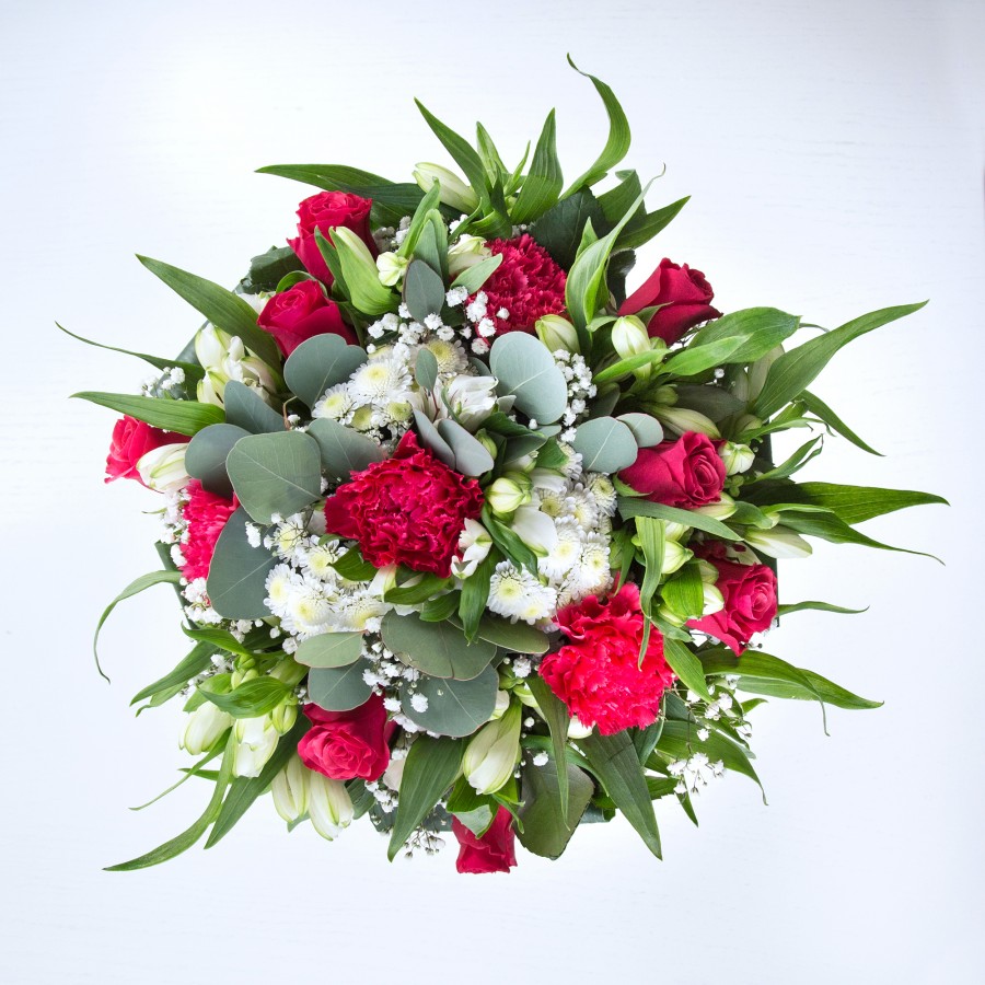 Immerse yourself in the beauty and uniqueness of our Exquisite Elegance Bouquet. This stunning arrangement features a harmonious blend of luxurious red roses and delicate white chrysanthemums, complemented by sweet gypsophila and vibrant carnations.